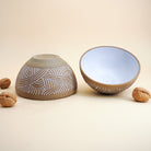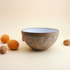 Si Nina tourne ses pots avec une vitesse étonnante, elle consacre un temps important à la réalisation du décor de ses objets. Pour cette gamme Zéphyr, elle se penche avec délicatesse sur les pièces encore fraîches pour y sculpter ce maillage de courbes, avec un petit outil qui lui permet de retirer de la matière et creuser. Le tour de force consiste bien entendu à ne pas percer la paroi fragile de ces grands bols qui subiront ensuite deux cuissons, dont une à haute température (1264°), qui confère à ces objets une excellente solidité. Ces grands bols peuvent ainsi supporter des cuissons dans nos fours domestiques comme pour, par exemple, servir une entrée ou un dessert chaud à vos convives !