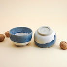 Posé sur son élégant pied creusé, signature de l'atelier vendéen Potikaa, ce petit bol en céramique bleu et blanc se fait bolinet du petit-déjeuner pour un enfant, bol à thé qui réchauffe le creux des mains ou ramequin pour vos dips de l'apéro !
