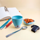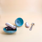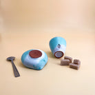 Cet ensemble ravissant est composé d'une tasse à café et d'une coupelle cœur qui devient sucrier ou ramequin orignal pour des gourmandises sucrées. La forme conique de cette tasse en faïence parfaitement régulière est habillée d'un duo d'émail bleu et blanc, souligné par un pied laissé en terre rouge, brute, qui rappelle l'art organique de la céramique artisanale.