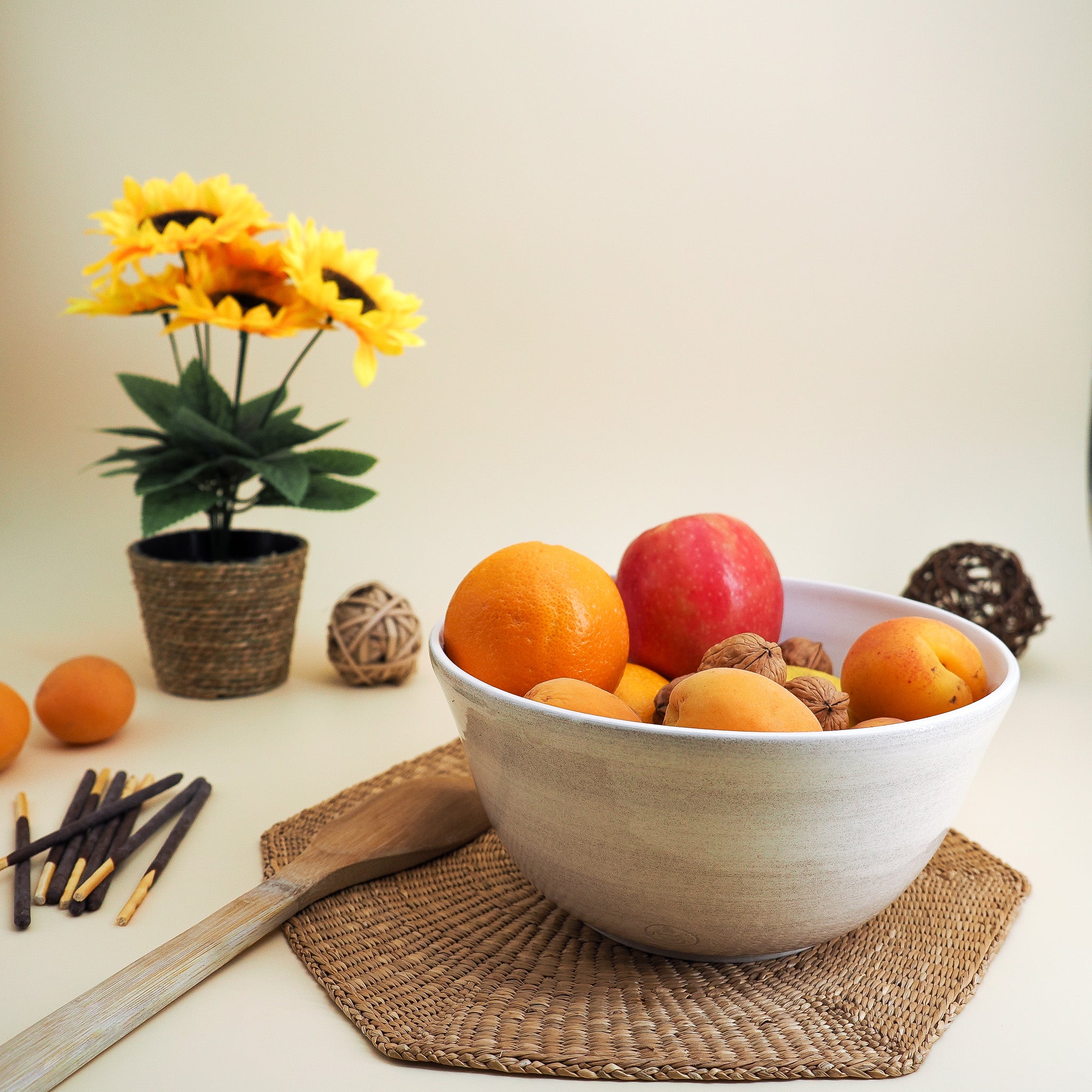 Tourné, peint et émaillé à la main dans l'atelier marseillais du Chat Potier, ce saladier fait partie de la large collection Solstice, empreinte de délicatesse tout autant que du sens pratique de la céramiste. En effet, ces saladiers arrondis s'empilent parfaitement pour un rangement facilité... même si on l'a dit : vous ne voudrez sûrement pas les remiser aux placards !