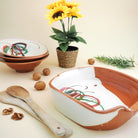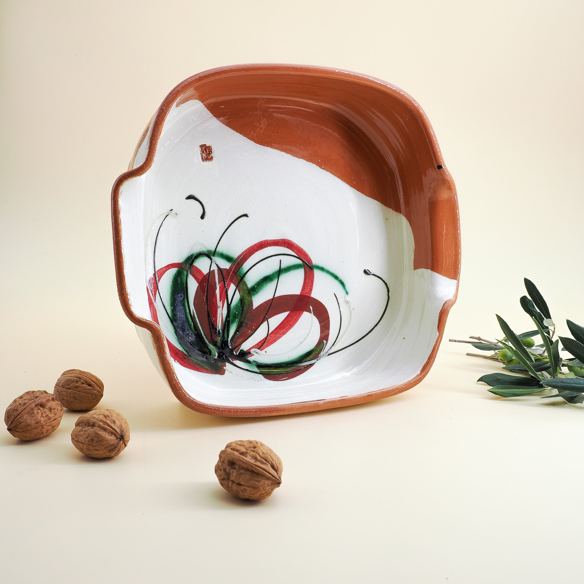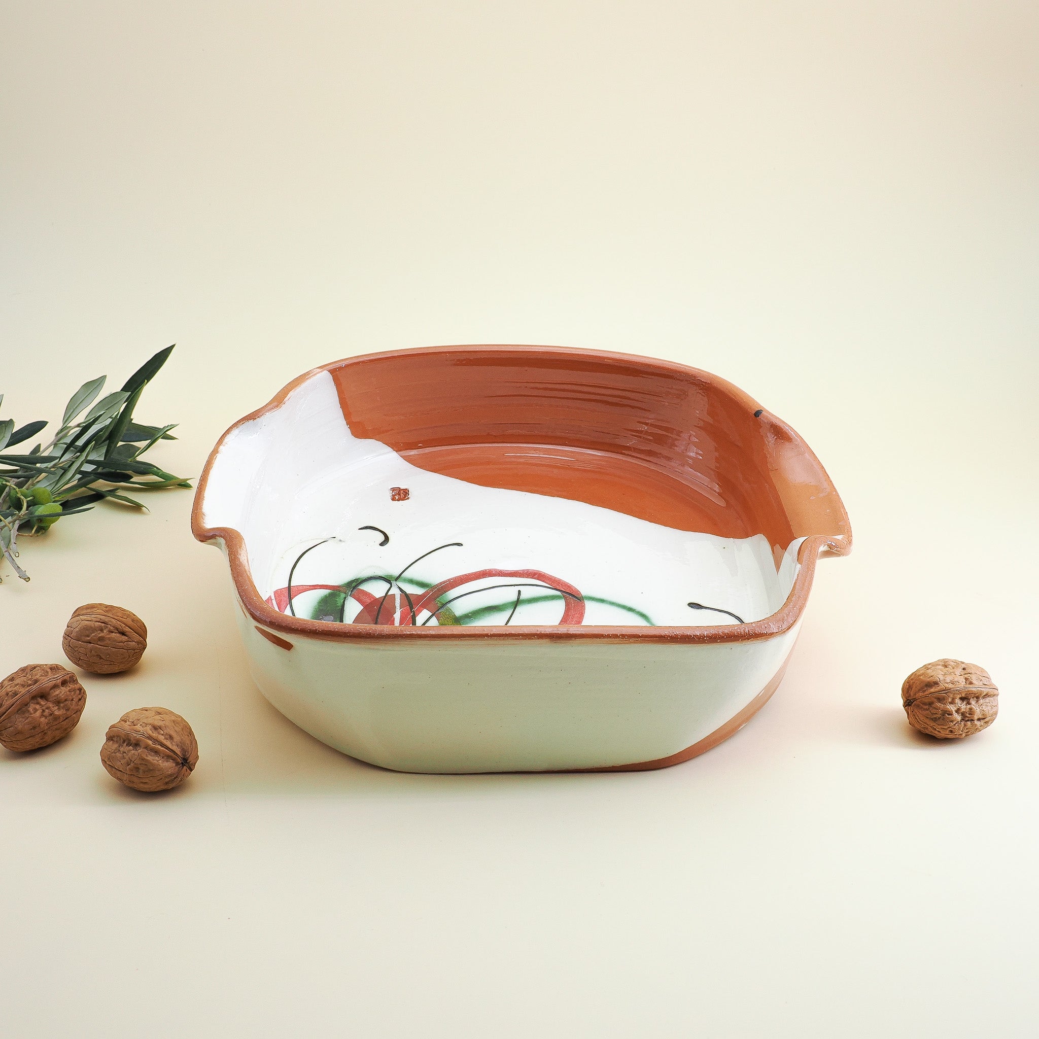 Le plat à gratin de l'atelier DMB Céramique, confectionné à la main par la talentueuse Mathilde, est une invitation à passer derrières les fourneaux ! Sa forme de carré arrondi et généreuse offre un beau terrain de jeux pour tous les cuistots qui aiment préparer le repas pour de grandes tablées. Tians et gratins de toutes natures sont conviés dans ce beau plat en faïence.