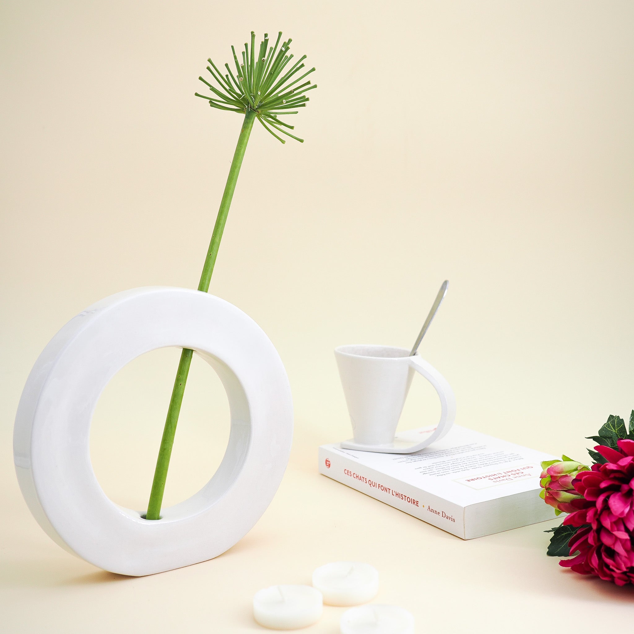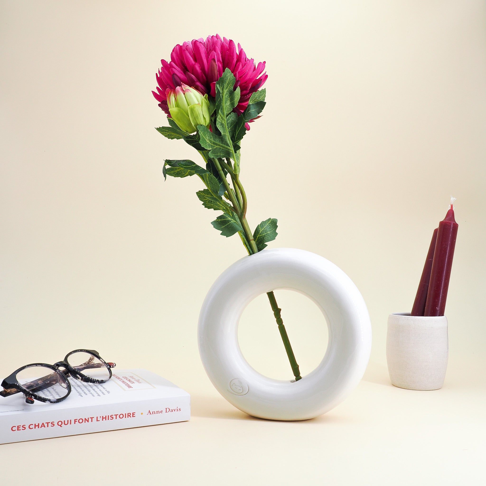 Ce drôle d'objet est un vase soliflore en céramique. Sa forme est une création signée de l'atelier marseillais du Chat Potier. On le remplit d'eau pour assurer une bonne assise et on y plante une fleur unique qui se place en diagonale de ce vase atypique.